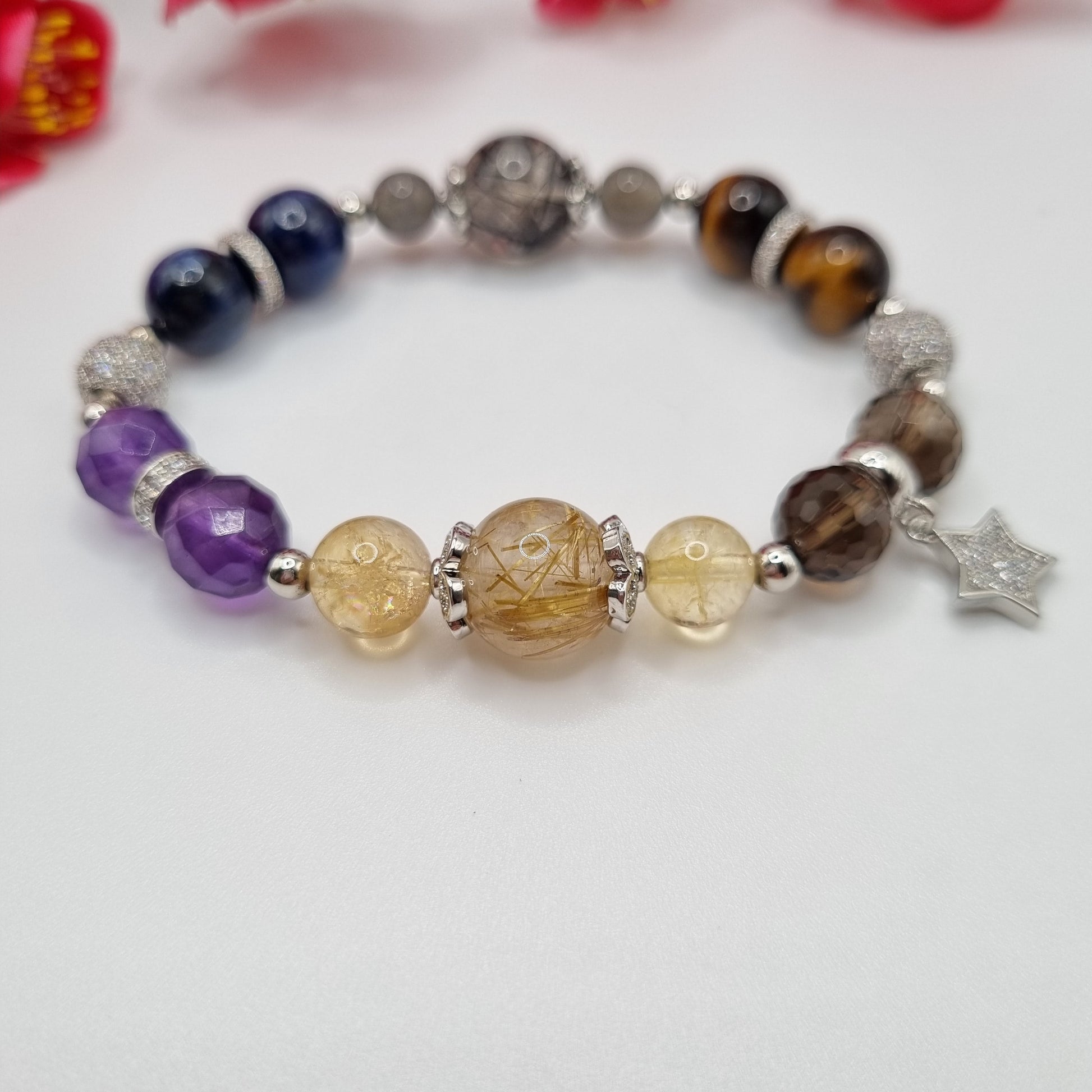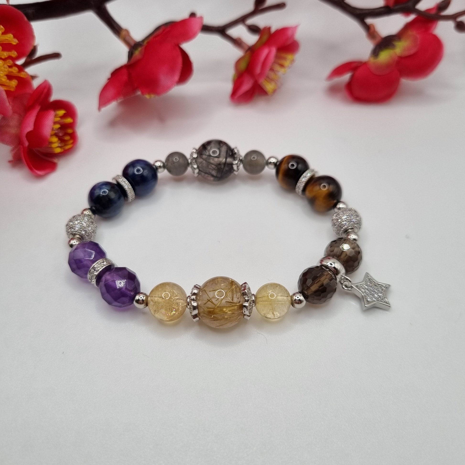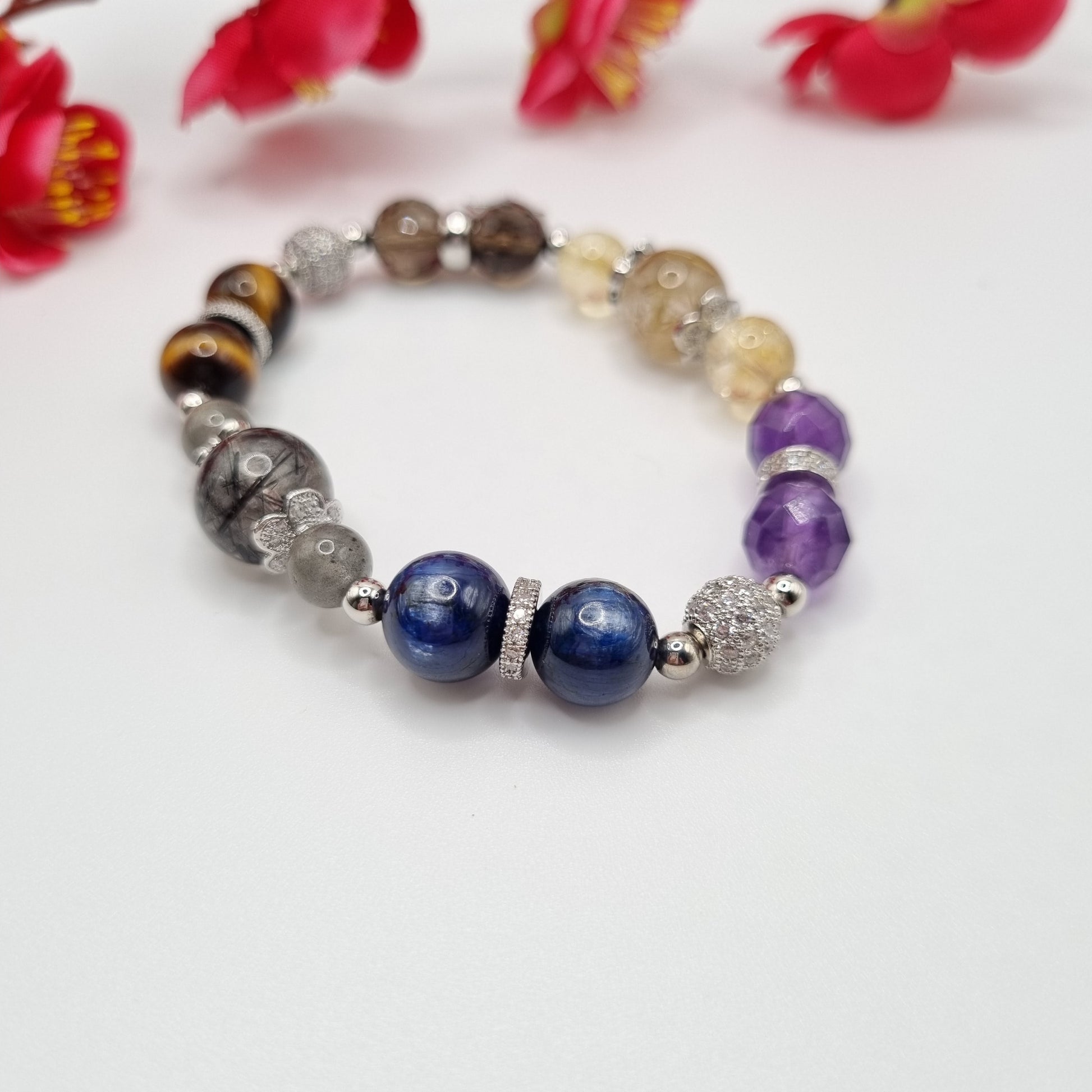 Crystals: Gold rutilated quartz, Black Rutilated Quartz, Kyanite, Amethyst, Smokey Quartz, Yellow Tiger Eye, Yellow Azeztulite and Labradorite