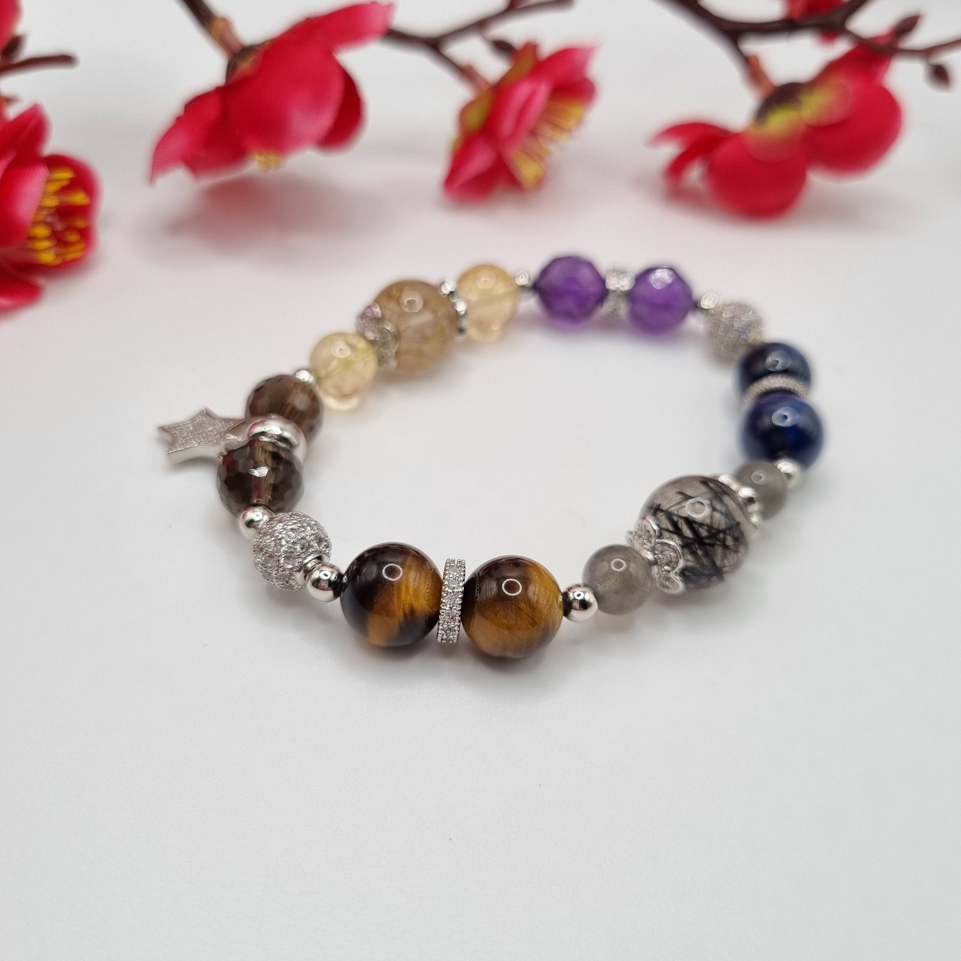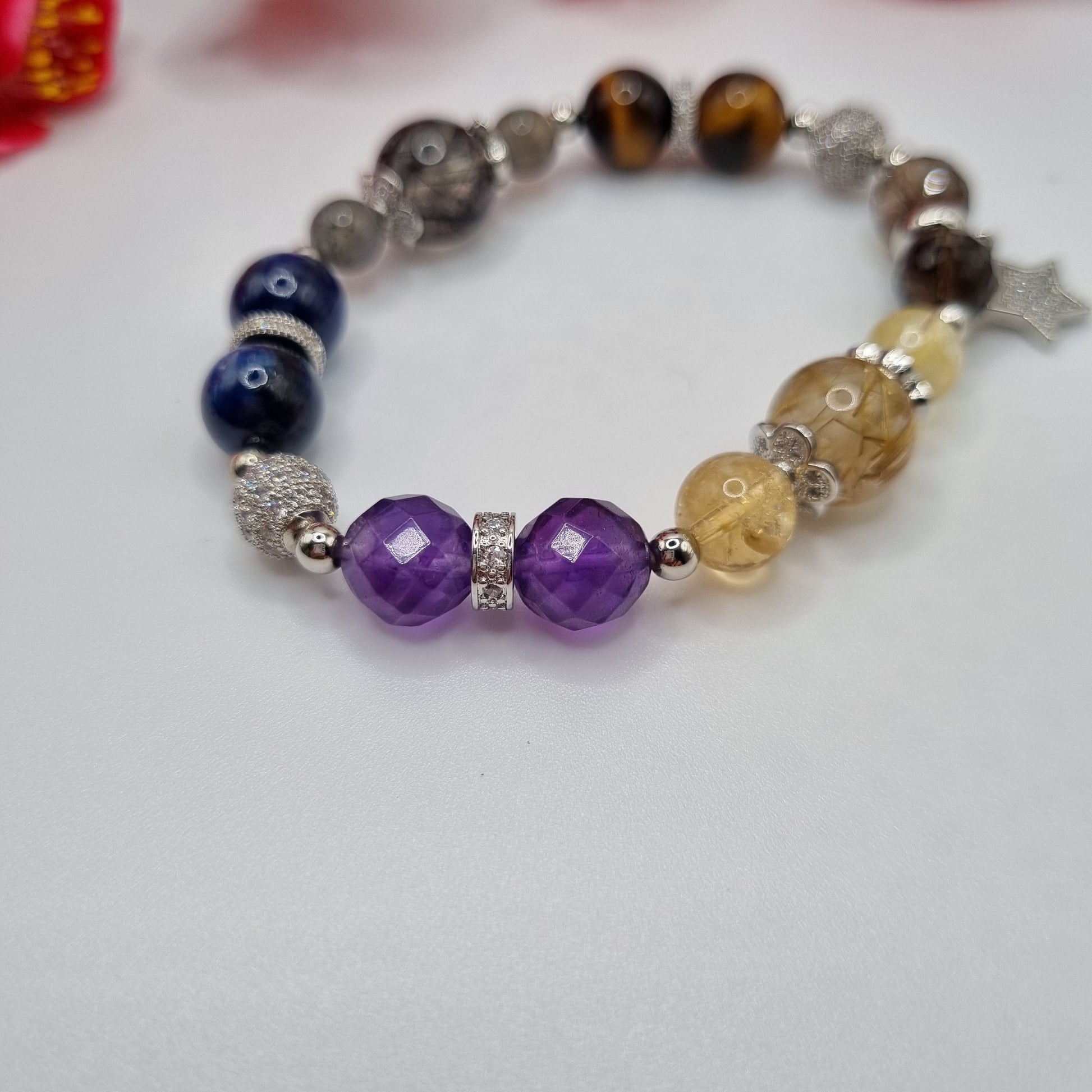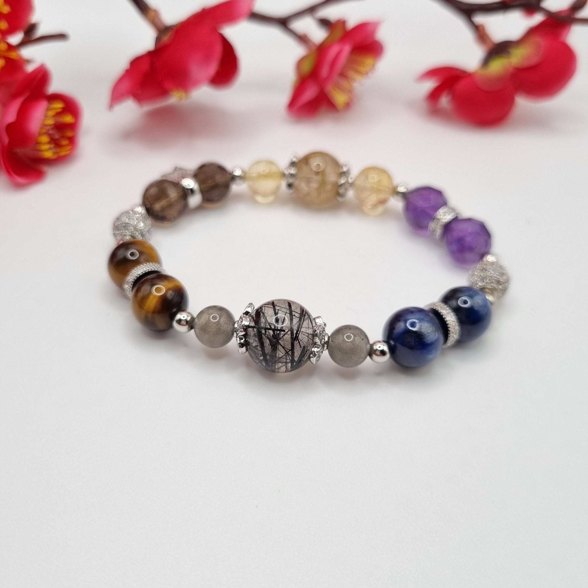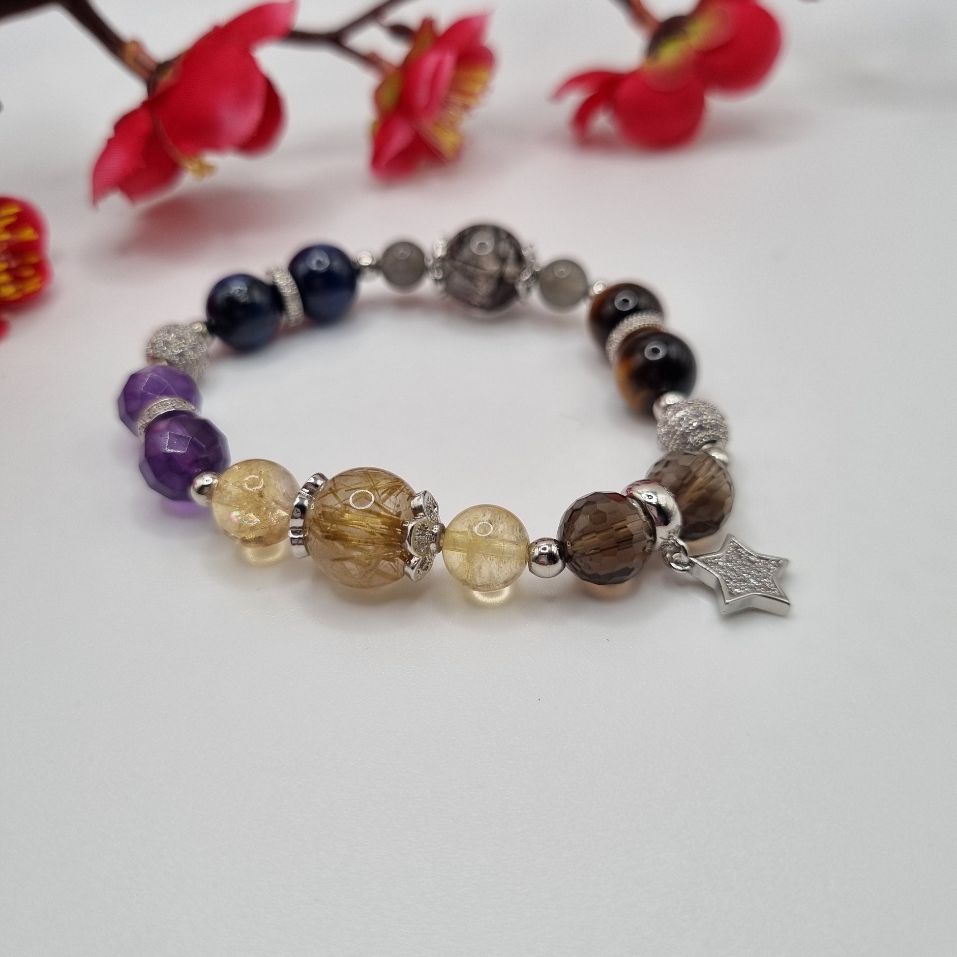Crystals: Gold rutilated quartz, Black Rutilated Quartz, Kyanite, Amethyst, Smokey Quartz, Yellow Tiger Eye, Yellow Azeztulite and Labradorite